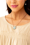 ​Suspended between the center of a dainty copper paperclip chain, a faceted light blue stone is pressed into a sleek copper fitting for a seasonal, rustic flair. Features an adjustable clasp closure. As the stone elements in this piece are natural, some color variation is normal.