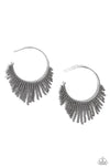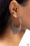 Cascading strands of gunmetal seed beads stream out from the bottom of a classic silver hoop, resulting in a flirtatiously tasseled look. Earring attaches to a standard post fitting. Hoop measures approximately 1 1/2" in diameter.