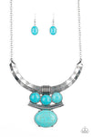 Oversized turquoise stone accents alternate with mismatched silver frames, coalescing into a dramatic tribal inspired pendant below the collar. Features an adjustable clasp closure.