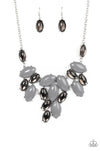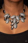 Oval shaped smoky and Ultimate Gray beads, set in exaggerated silver pronged settings and suspended from silver chains, coalesce into an asymmetrical arrangement that makes a bold impact below the collar. Features an adjustable clasp closure.