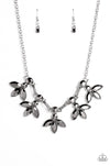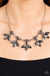 Featuring smoldering marquise style cuts, oversized hematite gems fan out from an interconnected, circular hematite rhinestone display. Separating the dauntless florals, airy silver ovals, stamped with a dot motif, create additional eye-catching sheen. Features an adjustable clasp closure.