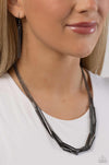 Featuring hollow cylindrical gunmetal accents, five dainty strands of gunmetal chains layer around the collar for an industrially assertive centerpiece. Features an adjustable clasp closure.