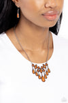 Infused with studded silver frames, glassy orange teardrop beads cascade from the bottom of haphazardly stacked triangular and teardrop orange beads that delicately connect into an ethereal centerpiece below the collar. Features an adjustable clasp closure.