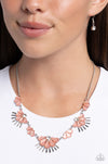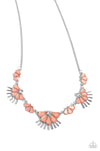 Three milky Desert Flower teardrops, set in dainty pronged fittings, alternate with solitaire white rhinestones that give way to a cluster of larger milky Desert Flower teardrops. Sleek silver bars flare out from the exaggerated teardrop display creating a fan-like arrangement along the neckline for a sense of refinement. Features an adjustable clasp closure.