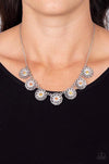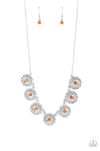 Dotted with dark and light orange rhinestone centers, decorative silver flowers bloom from circular silver frames as they link below the collar for a flirtatious floral fashion. Features an adjustable clasp closure.