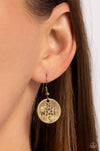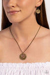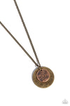 Two varying sizes of interconnected brass and copper discs brushed in an antiqued grit swing below a classic brass chain. The oversized brass disc features the phrase "Lead Me, Guide Me" as the font curves up around the upper disc. The smaller, uppermost copper disc is stamped with a simple compass design, following its inspirational motif. Features an adjustable clasp closure.