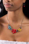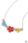 Dainty, glistening 3D silver flowers alternate between various-sized turquoise, red, and yellow stony blossoms with tactile silver centers for an earthy pop of color beneath the collar. Features an adjustable clasp closure. As the stone elements in this piece are natural, some color variation is normal.
