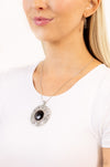 Rippling around an oversized black cat's eye stone, hammered silver frames, with tilted silver accents, twist into three textured layers. A border of dainty white rhinestones dusts the black cat's eye stone for a touch of glitz amongst the textured hoops. A dainty silver snake chain boosts the oversized labyrinth-styled pendant, further showcasing the exaggerated design. Features an adjustable clasp closure.