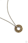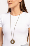 A stacked row of glittery white rhinestones attaches to a pitted hoop that is hammered in natural inspired patterns, creating a refined relic at the bottom of a lengthened brass chain. Features an adjustable clasp closure.