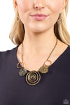 Featuring an array of studded, hammered, textured, and antiqued finishes, a mismatched collection of imperfect brass and shiny gold discs and hoops delicately interlock and connect below the collar to create a rustic statement piece. Features an adjustable clasp closure.