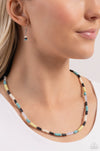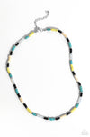 Infused with dainty silver accents, multicolored stone discs featuring a startling black, are threaded along an invisible wire below the collar creating a natural pop of seasonal inspiration. Features an adjustable clasp closure. As the stone elements in this piece are natural, some color variation is normal.