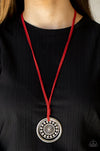 A lengthened piece of red suede cording is knotted around a silver ring and a decorative studded silver frame, creating a whimsy mandala-like pendant. Features an adjustable clasp closure.