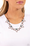 Featuring patina-brushed centers, dainty copper petals delicately link together and fan out below the collar for a whimsical fashion. Features an adjustable clasp closure.