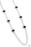 Pressed in sunburst-like, rhinestone-encrusted pronged silver fittings, a collection of emerald-cut black gems are infused between a double-strand of silver chains for a standout statement. Features an adjustable clasp closure.