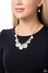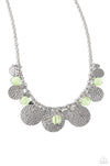 Cascading from a classic silver chain, a collection of various-sized hammered silver discs and green cat's eye beads twinkle below the neckline for a radiant display. Features an adjustable clasp closure.