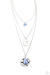 Three mismatched shiny silver chains layer below the collar. A glossy baroque light blue pearl swings from the uppermost chain above a white pearl-painted disc and hammered shiny silver pendant with a light blue baroque pearl center for a dignified layered look. Features an adjustable clasp closure.