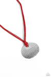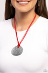 A meticulously hammered silver frame is knotted in place with red cording, invoking an artisan inspired aesthetic. Features an adjustable clasp closure.