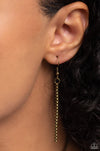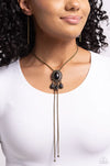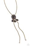 Strung along a strand of brass round box chain, black stones, set in rope-textured frames, swing from the bottom of a larger, matching black stone set in an ornate frame, creating an earthy, adjustable fringe. Features a bolo closure. As the stone elements in this piece are natural, some color variation is normal.