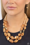 Varying in shape and opacity, a refreshing collection of sparkle-infused brown and Doe beads layer below the collar for a boldly colorful look. Accents of faceted gold beads and gold studs are infused throughout the design for a subtle touch of additional sheen. Features an adjustable clasp closure.