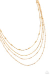 Multiple layers of dainty gold chains coalesce down the neck into a monochromatic mashup. Gold accents and dainty gold beads are infused throughout the chains for additional shimmer. Features an adjustable clasp closure.