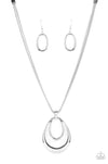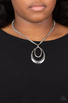 Two shiny silver oval frames delicately coalesce into a glistening pendant at the bottom of layered rows of silver box chain, creating a classic metallic look below the collar. Features an adjustable clasp closure.