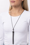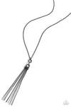 Attached to a clasp closure that glides along a classic gunmetal chain, a sleek gunmetal fitting cascades down the chest, creating a fiercely stacked pendant. Sleek gunmetal snake chains swing from the bottom of the fitting, creating an eye-catching fringe. Features an adjustable clasp closure.