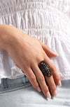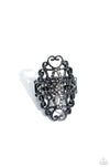 Dainty hematite rhinestones are encrusted along a glistening gunmetal frame radiating with regal filigree for a refined look. Features a stretchy band for a flexible fit.