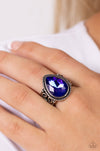 Featuring an iridescent UV finish, an oversized purple teardrop gem is pressed in the center of a textured silver frame atop a thick silver band whirling with silver filigree. Features a stretchy band for a flexible fit. Due to its prismatic palette, color may vary.