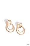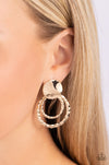 Two shiny hammered gold circles swing from a wavy gold disc, creating a captivating lure. Earring attaches to a standard post fitting.