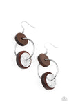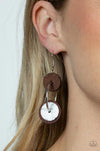 An earthy collection of brown wood and white stone discs are threaded along a silver hoop, linking into a trendy lure for an artisan inspired fashion. Earring attaches to a standard fishhook fitting.