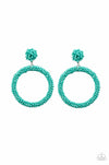 A refreshing collection of dainty turquoise seed beads are woven around a circular frame at the bottom of a matching beaded fitting, creating a colorful hoop. Earring attaches to a standard post fitting.
