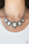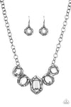 Featuring imperfect gunmetal frames, a collection of diamond, oval, and emerald-cut white rhinestones connect below the collar in a blinding fashion. Features an adjustable clasp closure.