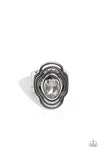Dainty studded silver bars delicately weave around a smoky gem center, creating an edgy, airy centerpiece atop the finger. Features a stretchy band for a flexible fit.