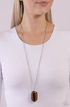 Swinging from an elongated silver chain, a thick tiger's eye stone, wrapped in a silver frame creates an environmentally impactful statement down the chest. Features an adjustable clasp closure. As the stone elements in this piece are natural, some color variation is normal.