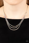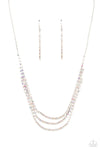 Featuring square fittings staggered rows of iridescent rhinestones cascade from a dainty silver snake chain below the collar. The interconnected rows delicately give way to freefalling layers, adding glitzy movement to the sparkling centerpiece. Features an adjustable clasp closure.