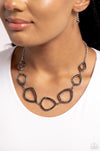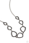 Encrusted in smoky hematite rhinestones, asymmetrical teardrop and geometric silver frames delicately link below the collar for a refined edge. Features an adjustable clasp closure.
