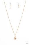 Dotted in dainty gold studs and glittery white rhinestones, leafy gold frames delicately fold around the bottom of a white cat's eye stone teardrop, resulting in an ethereal pendant below the collar. Features an adjustable clasp closure.