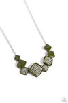 Infused along a classic silver chain, tilted, glossy, olive-painted squares lead the eye to rhinestone-embossed olive-painted squares that alternate in size, creating a standout statement below the collar. Features an adjustable clasp closure.