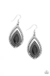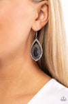 Textured curls of high-sheen silver wrap around a studded teardrop frame. Pressed in the center of the studded frame, a vibrant black teardrop stone rests for an earthy pop of color. Separating the spirals from the studs, an airy backdrop is incorporated into the design to draw attention to the ear. Earring attaches to a standard fishhook fitting. As the stone elements in this piece are natural, some color variation is normal.