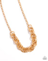 Pairs of textured gold hoops boldly interlock at the bottom of a chunky gold chain, resulting in a noisy statement piece below the collar. Features an adjustable clasp closure.