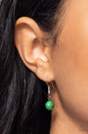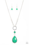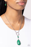 Encased in a sleek silver fitting, an oversized faceted Leprechaun teardrop bead swings from the bottom of a round Leprechaun bead and hammered silver hoop, culminating into a bold pop of color below the collar. Features an adjustable clasp closure.